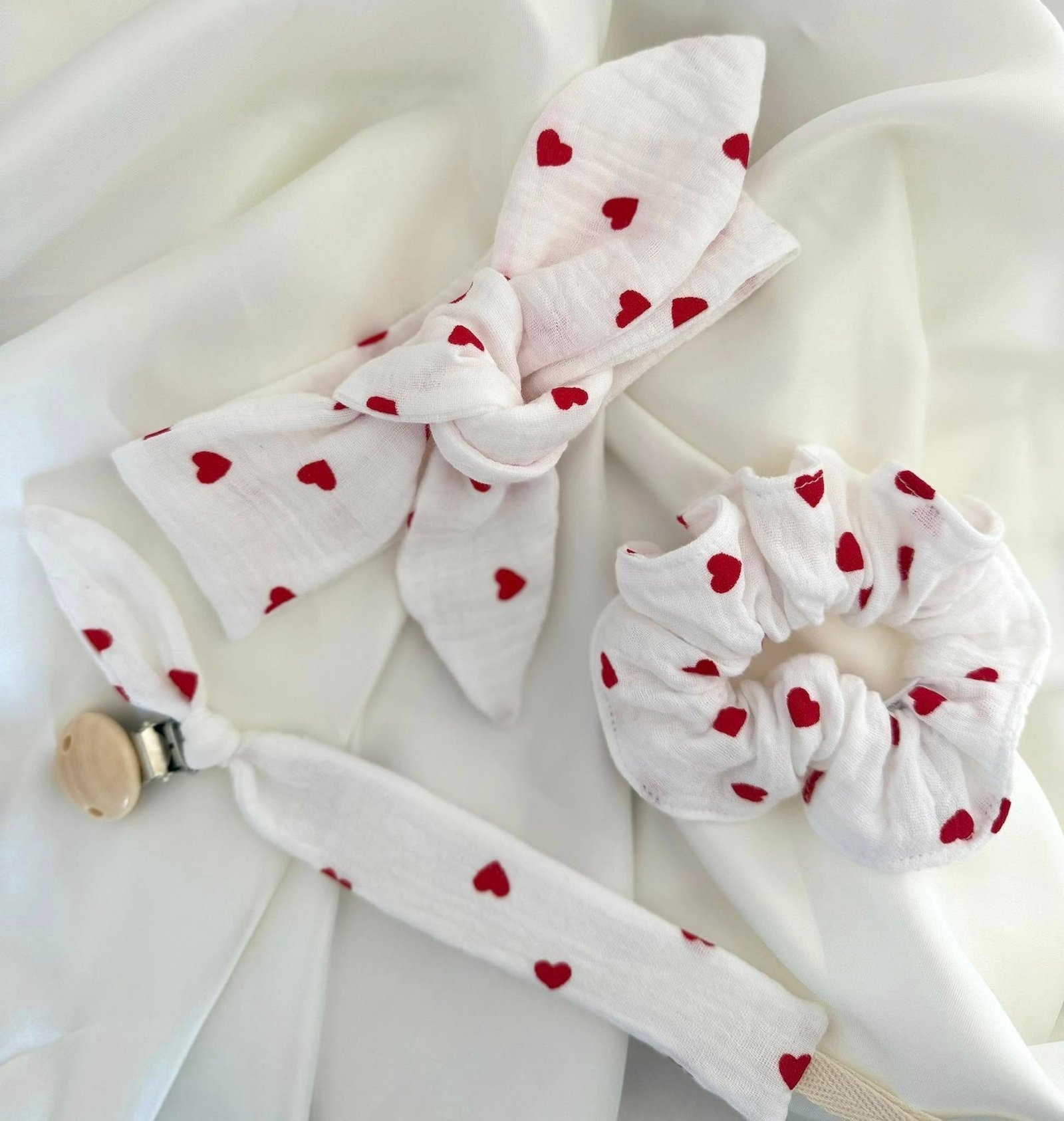 Soyez le premier à laisser votre avis sur “Lot attache tétine + chouchou motifs petits coeurs”